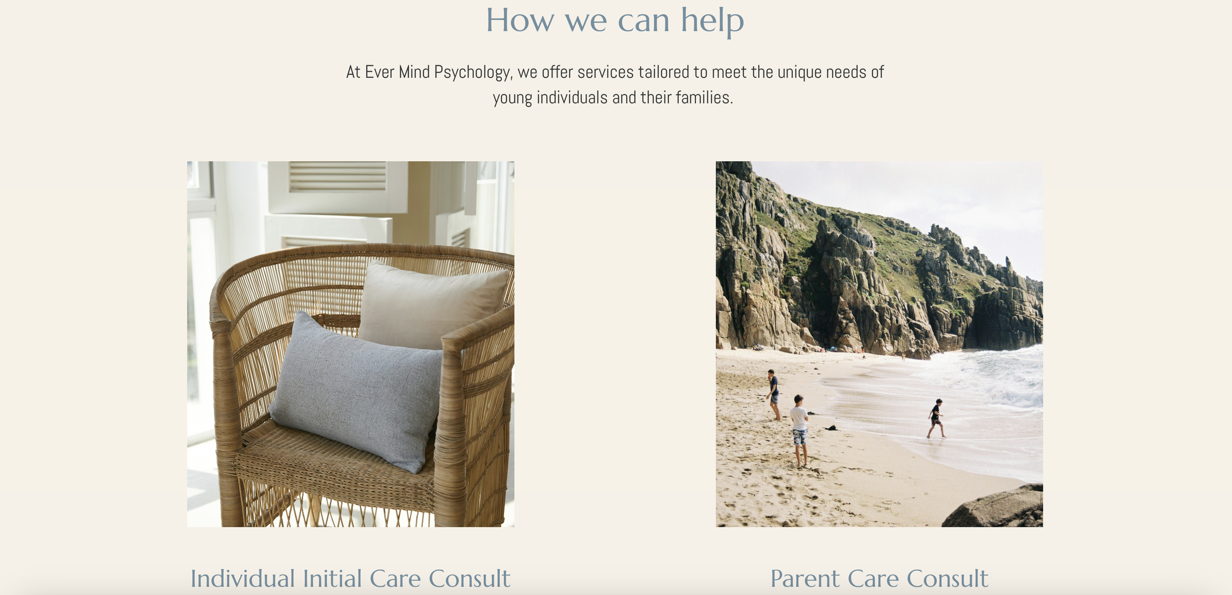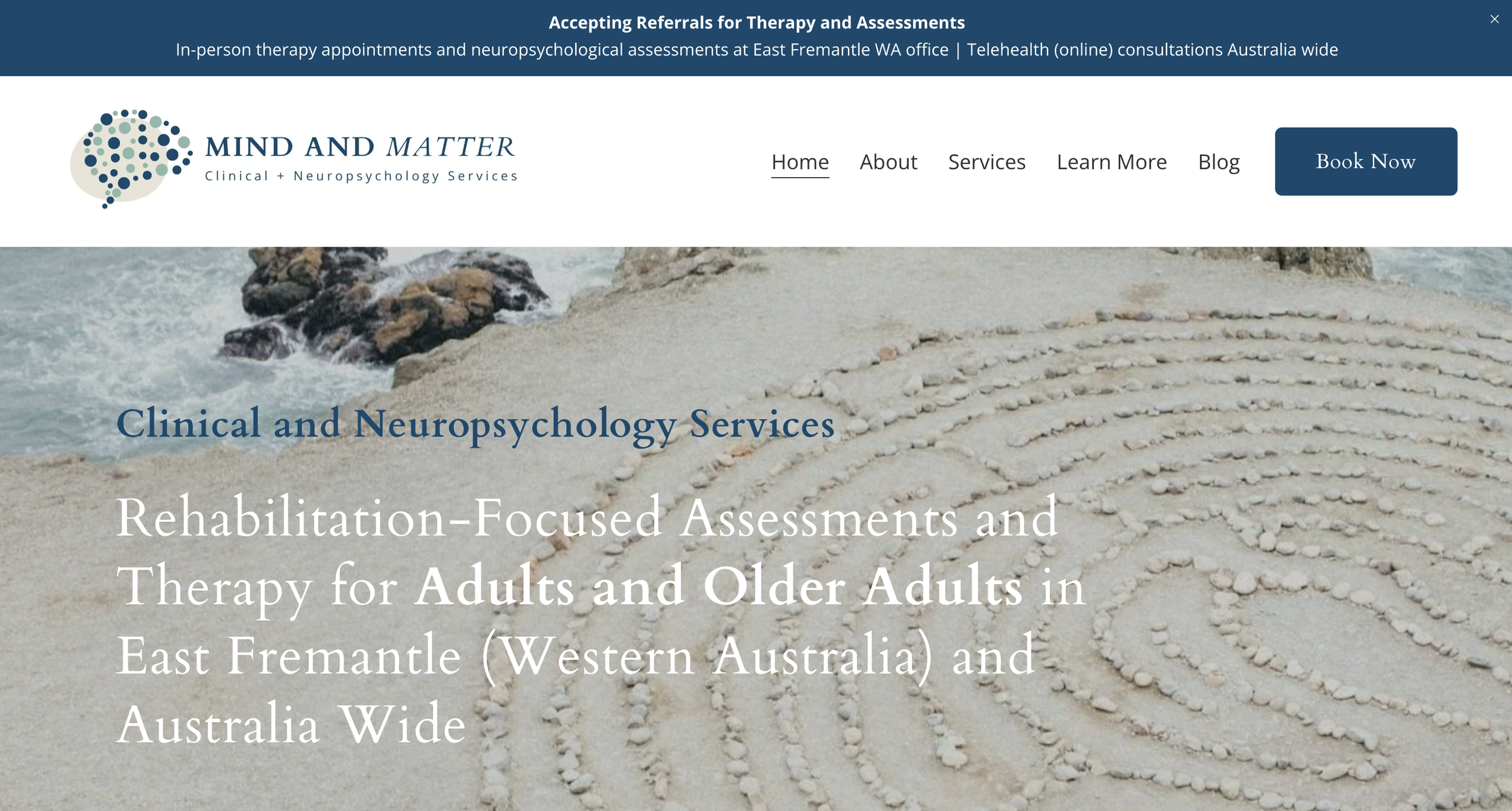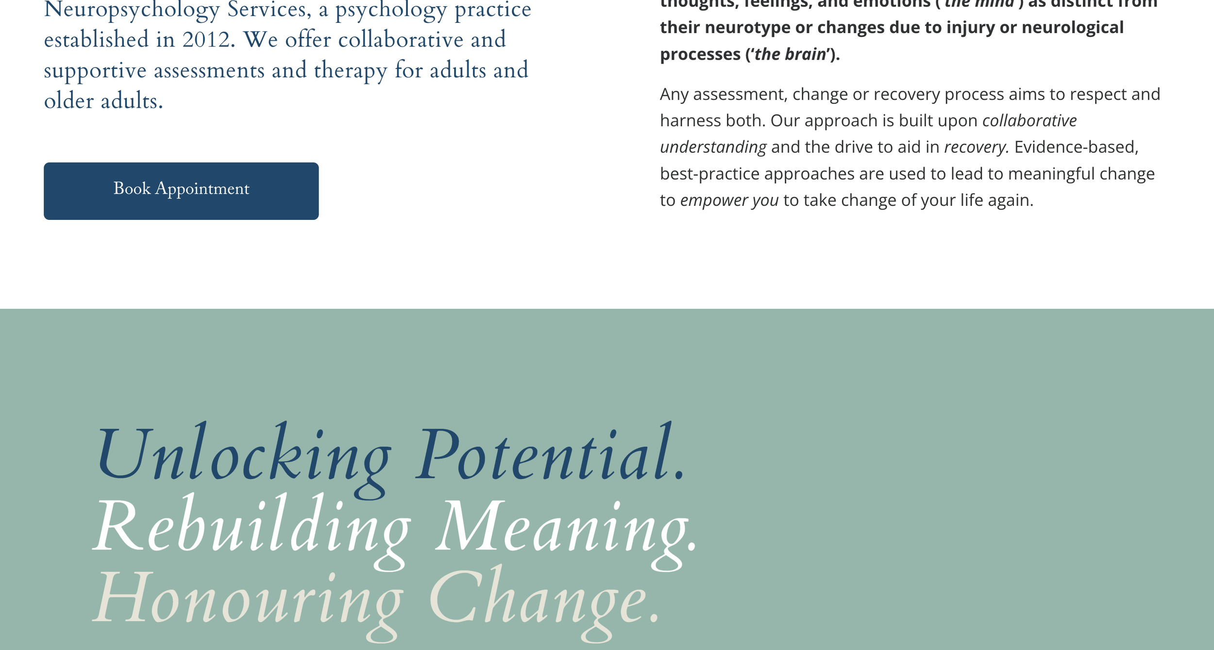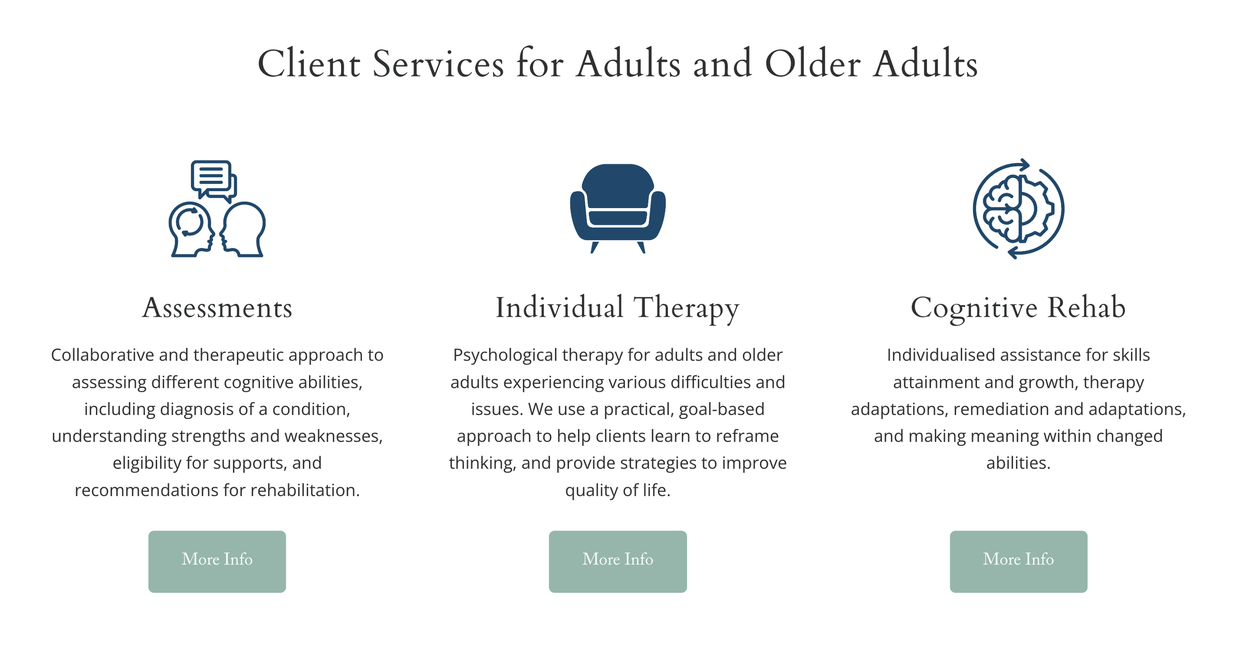 Brief: A professional website that caters to adults and older adults. Easy to read and navigate. Simple, calm, and warm aesthetic - incorporating coastal inspired and neuropsychological images (i.e., brain, puzzles).