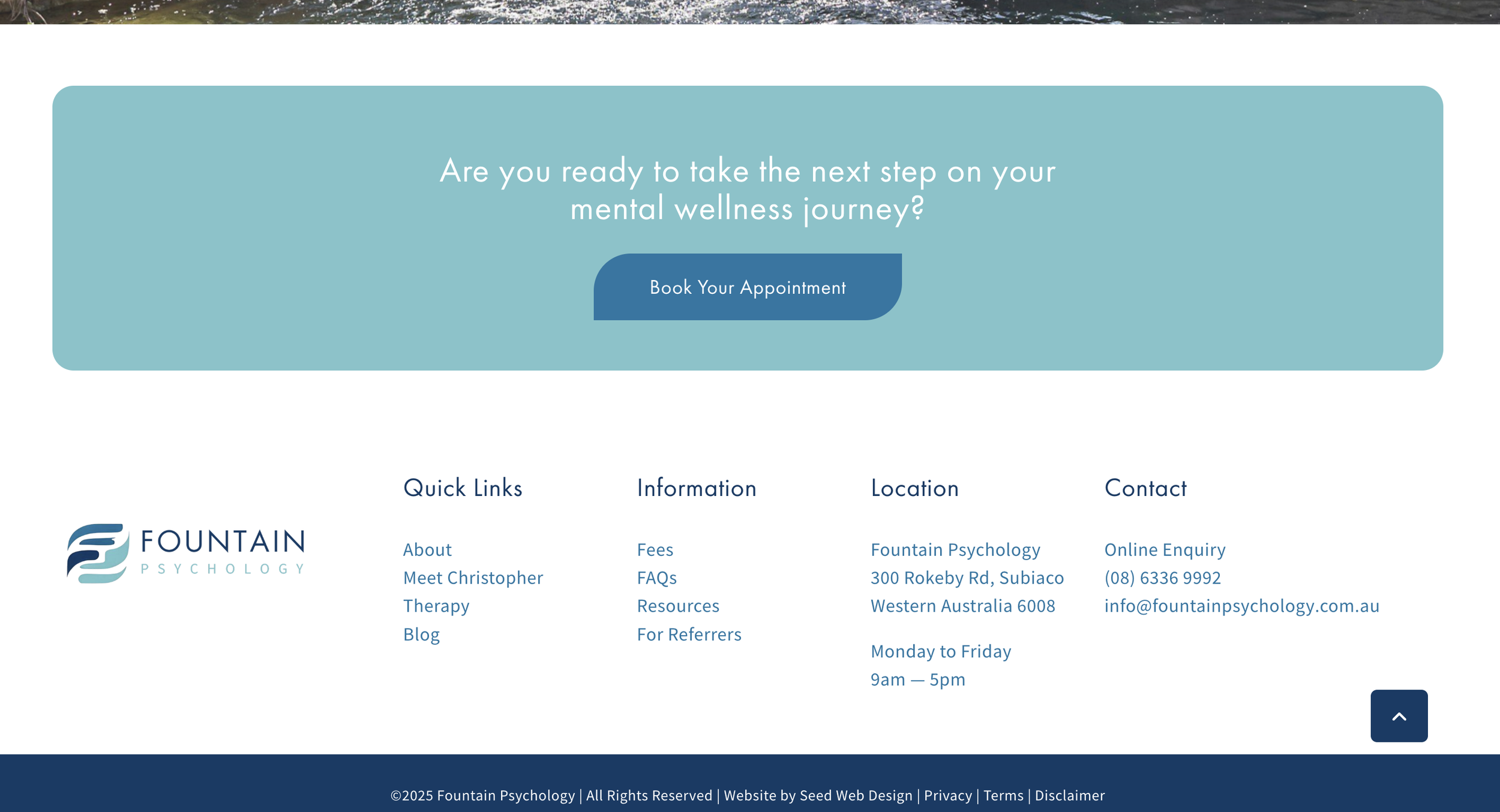 Brief: Simple, professional website incorporating fountain and nature landscape inspired images and colours (teal and blue).