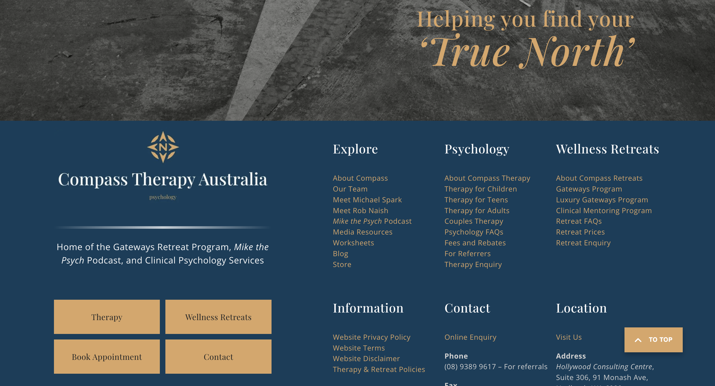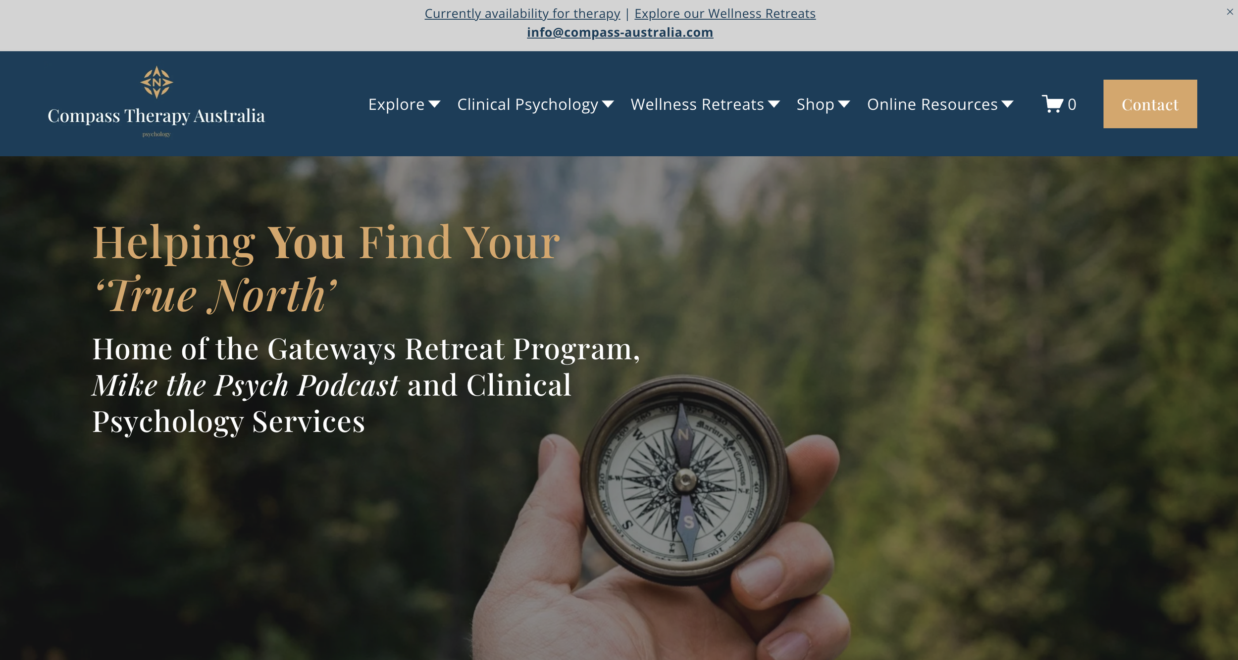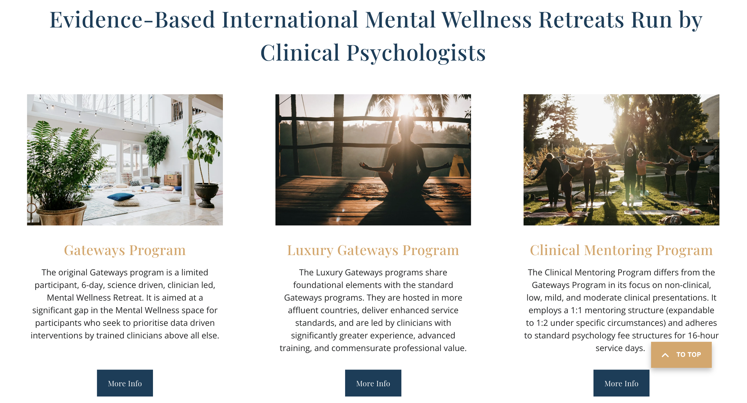 Psychology based service offering holistic care and various services, including therapy, international wellness retreats, online store, educational resources, and podcast.