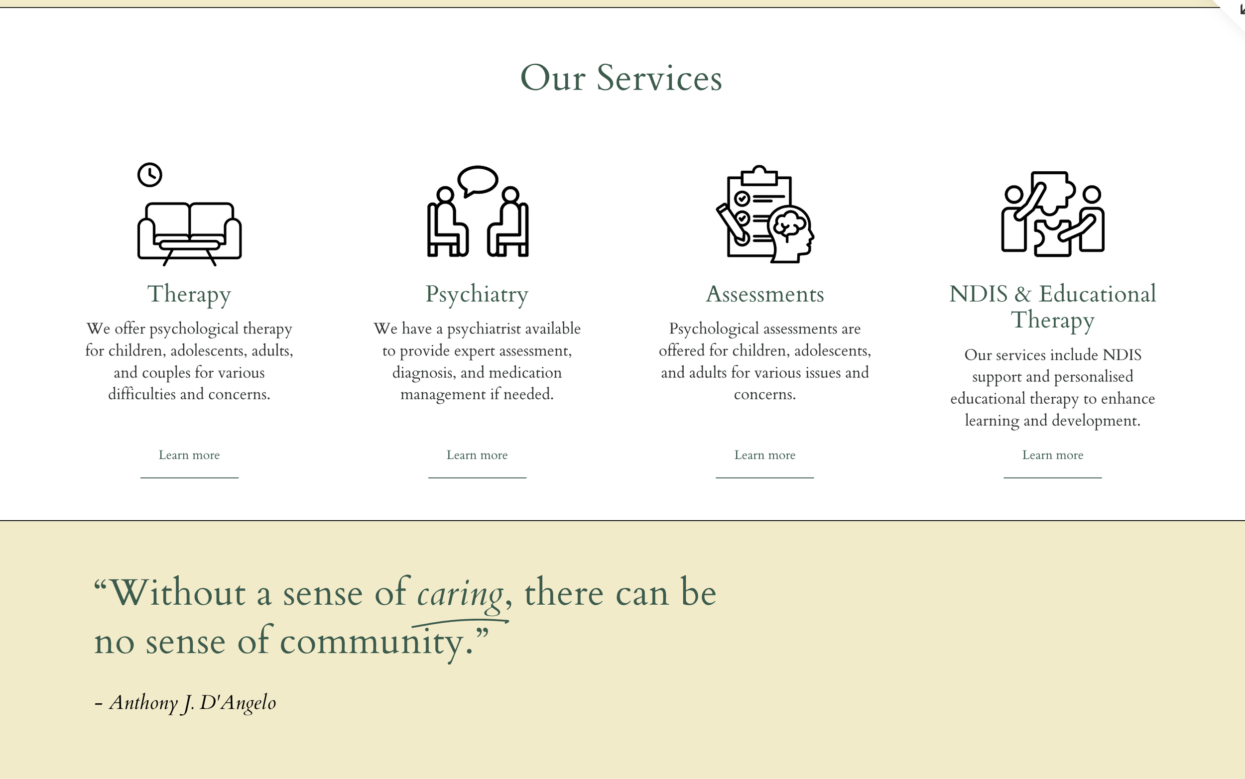 Medium Group Psychology Practice based on the Gold Coast offering various services for all ages including individual and group therapy, child and adult psychological assessments, and psychiatry services.