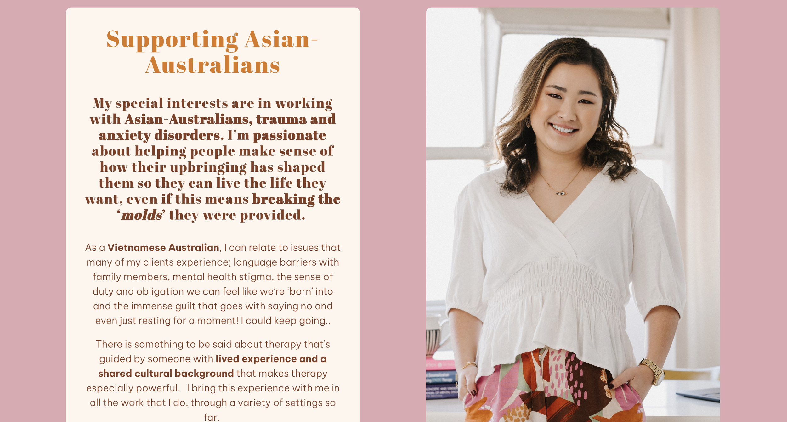 Small psychology private practice offering therapy for Asian-Australians and supervision for psychologists.
