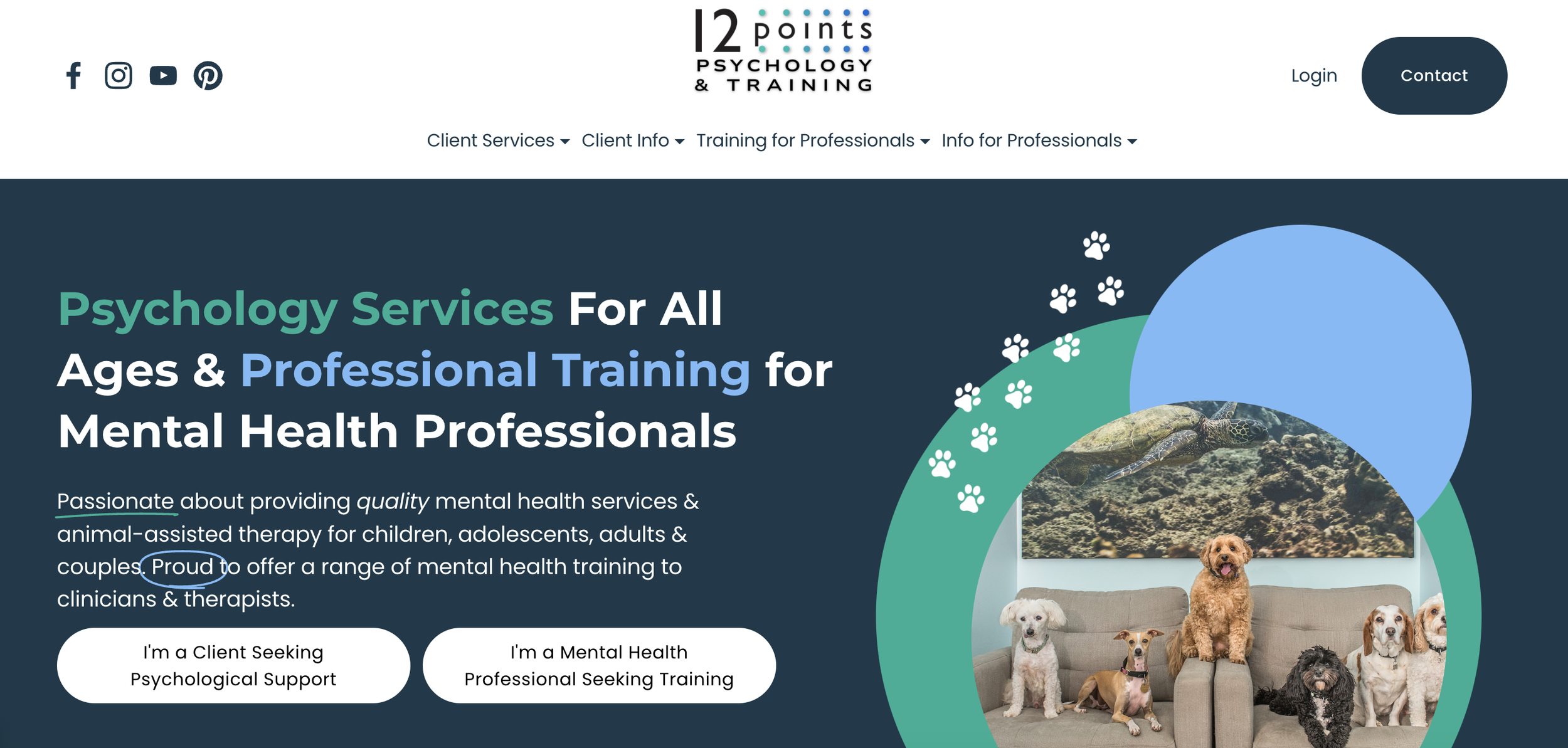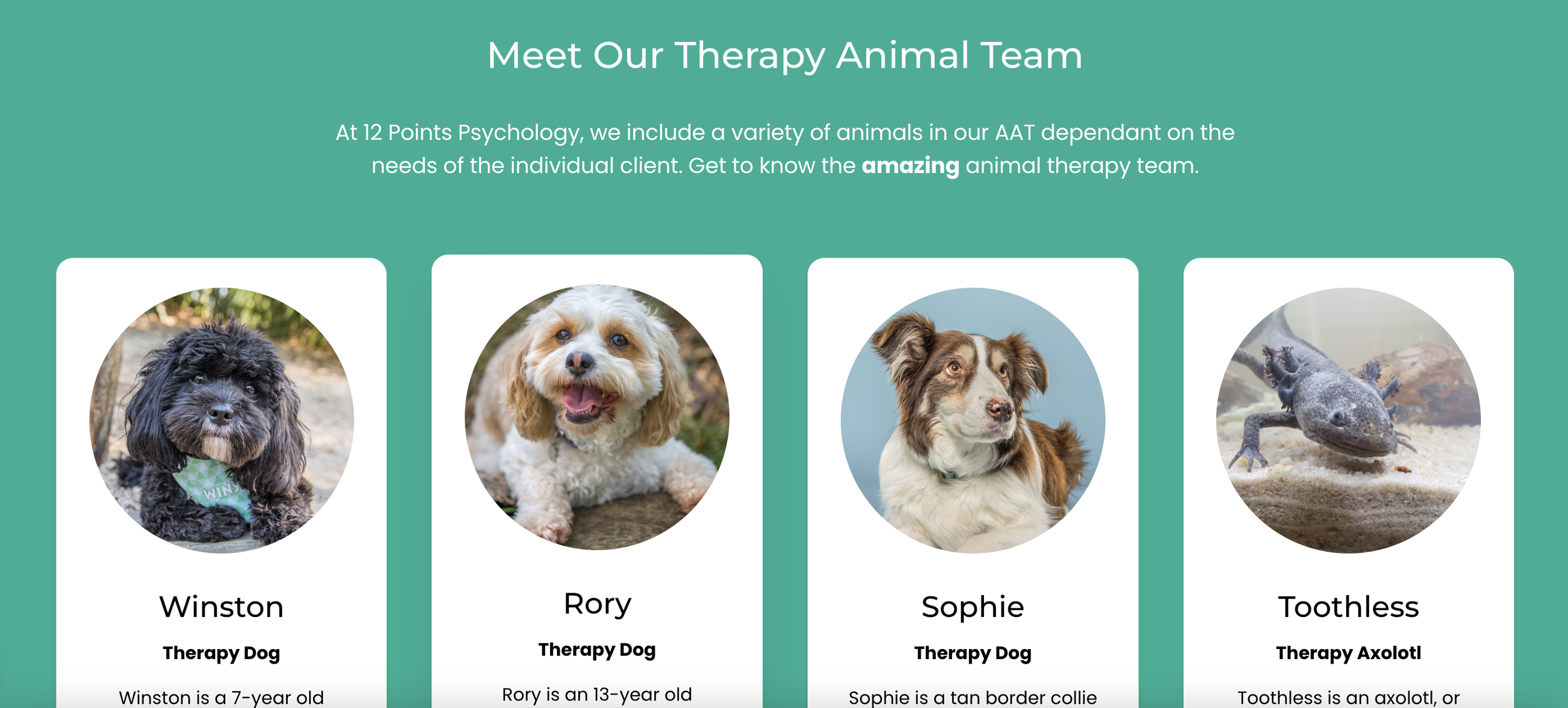Medium sized psychology private practice offering animal-assisted therapy for all ages and professional training services for allied health professionals.