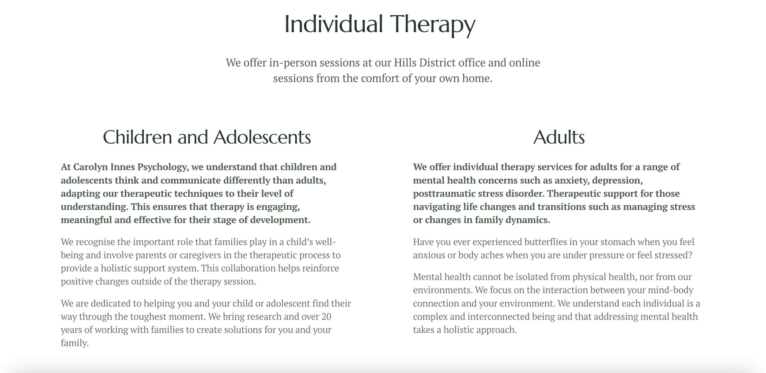 Group medium sized Private Psychology Practice offering therapy, behaviour support, and assessments for children, adolescents, and adults.